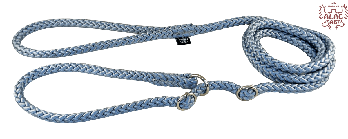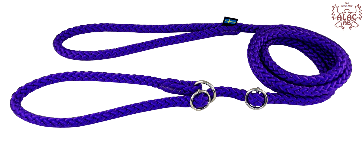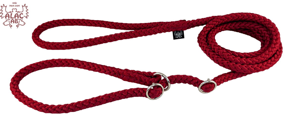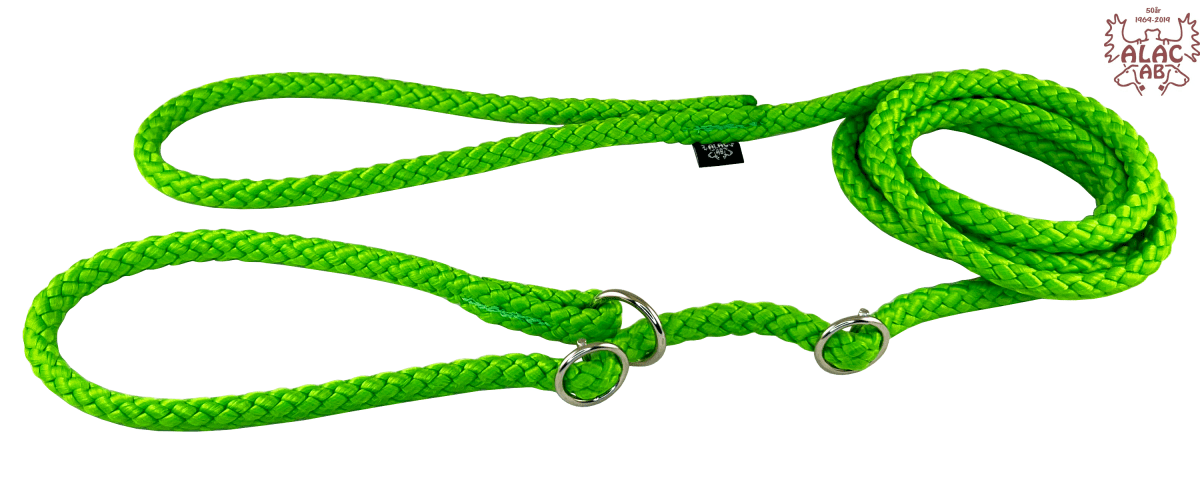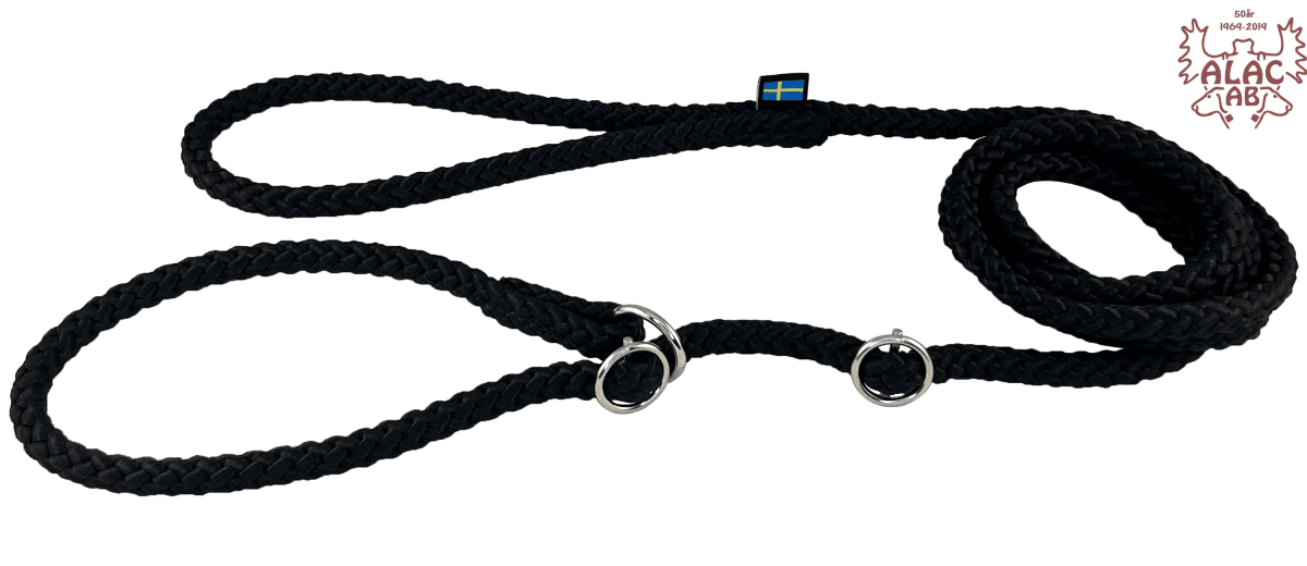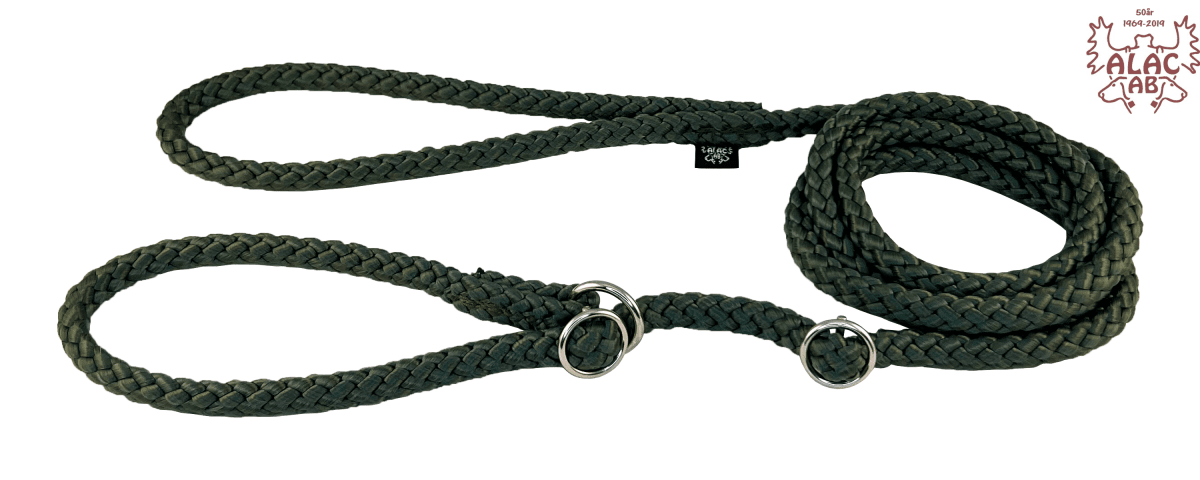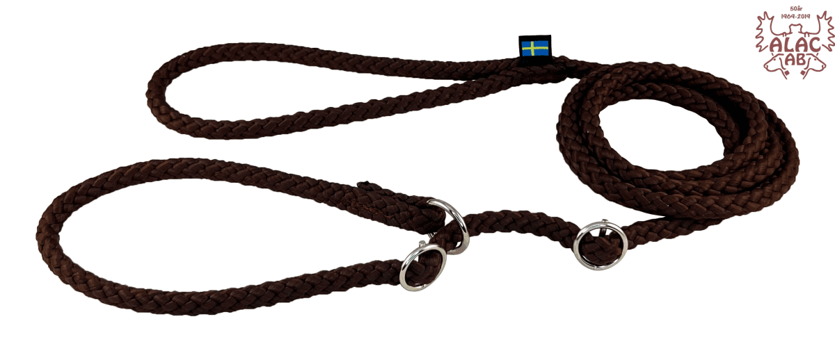 Retrieverkoppel av rundsnöre 10mm. Sydda, med förnicklad ring och dubbla stoppar av metall som lätt kan justeras. Lätt att stoppa i fickan när kopplet inte används.